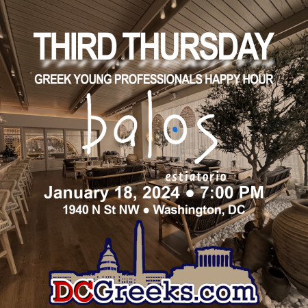 Since 2001, Third Thursday has provided Greek-Americans, Greeks, Cypriots, and Philhellenes from the Washington, DC area and beyond the chance to meet every month in a relaxed atmosphere, particularly welcoming those who have moved from different parts of the country for work or school into the greater DC area Greek community. With visits to a variety of bars, restaurants, and lounges in the most vibrant neighborhoods of DC, Maryland, and Virginia, Third Thursday is a great way to catch up with old friends and make new ones in the Greek community. We strive to maintain the simple principles of its founders while expanding the event to an ever-changing audience of Greeks in the area. We look forward to seeing you -- or meeting you for the first time -- at the next Third Thursday.