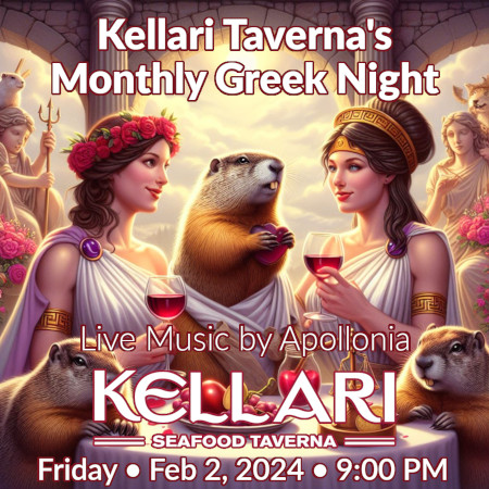 Join us on Friday, February 2, 2024 for a memorable night with authentic Greek food, wine, and dancing at the February 2024 edition of Kellari's Monthly Greek Night with live Greek music by Apollonia!