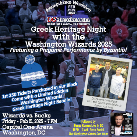 Friday, February 21, 2025 7:00 PM DCGreeks.com invites you to Capital One Arena on Friday, February 21, 2025 at 7:00 PM as the Washington Wizards take on Giannis Antetokounmpo the Milwaukee Bucks at our 9th Annual DCGreeks.com Greek Heritage Night with the Washington Wizards. Make sure you come early as we have a slot booked at pregame for a traditional Greek folk dance performance by DC's own Byzantio Greek Dance & Cultural Arts Program! PURCHASE TICKETS Ticket sales in our DCGreeks.com block are handled through our page on Fevo at https://fevogm.com/wiz-greek25. Discounted tickets are available in our blocks across multiple levels ranging from $38 - $225 per seat! The first 250 tickets purchased through this link will also include a special Greek Heritage Night Wizards beanie! Attendees are encouraged to purchase as soon as possible as tickets for this game will be in high demand, as this is the only time the Bucks are playing in DC during the 2024-25 season! AFTER THE GAME Join us at Penn Social, a short two block walk from Capital One Arena, as Apollonia Productions presents multi-platinum Greek recording artist, Panos Kiamos Live in DC with Eleftheria Eleftheriou as part of his 2025 North American Tour! Door open at 10 PM and the music goes from 11 PM - 3 AM. Tickets are now on sale at DCGreeks.com! Don't miss your chance to see Panos Kiamos in an up-close, intimate setting, with only 360 seats available - the ultimate nightcap to your Greek Heritage Night experience! ADDITIONAL NOTES Out of respect for our hosts and the courtesy theyve extended us by offering us a large group of discounted tickets for this game, please leave your Bucks jerseys/gear at home, but feel free to bring your Greek National Team jerseys/gear and Greek flags to support our dancers and to welcome Giannis and cheer him on throughout the game. Please check with DCGreeks.com for additional details regarding this event as they become available. About DCGreeks.com's Αποκριάτικο Weekέντι 2025 Join Greeks and Philhellenes from the DC area and beyond from February 20-22, 2025 for our inaugural Αποκριάτικο Weekέντι four events over three straight days to welcome Greek superstars Giannis Antetokounmpo and Panos Kiamos to town on Friday, February 21, 2025! With our regularly scheduled Third Thursday Happy Hour falling the night before an already spectacular alignment of Giannis and Kiamos on the same night, we decided to make it a weekend and add a brunch on Saturday morning to truly make this not just a γλέντι but a Weekέντι! Join us in DC for a unique opportunity to see both Giannis and Kiamos on Friday, extend your stay by joining us on Thursday for a Late Night Happy Hour at Balos Estiatorio, and stay for brunch on Saturday at For Five Coffee City Center's location featuring For Five Coffee Roasters signature coffee, pastries, and cocktails! To make it easier for those coming from out-of-town or locals wanting to stay downtown for the weekend, we've secured a hotel block at the AC Hotel Washington, DC Convention Center, walking distance from the Wizards-Bucks game at Capital One Arena and the Kiamos Concert at Penn Social on Friday Night, and the brunch the next morning at For Five Coffee City Center. Events of the Αποκριάτικο Weekέντι 2025 include: