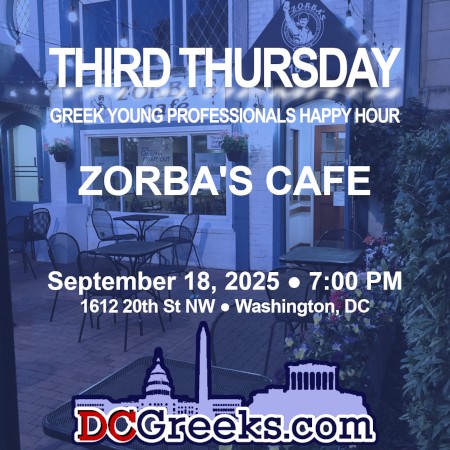 Join us on Thursday, September 18, 2025 at 7:00 PM as the Third Thursday Greek Young Professionals Happy Hour series celebrates the end of Summer 2025 with a return to Zorba's Café in Dupont Circle. This is typically our best attended Third Thursday of the year, so we're expecting a big crowd, especially in light of the great turnouts we've had over the past few months!