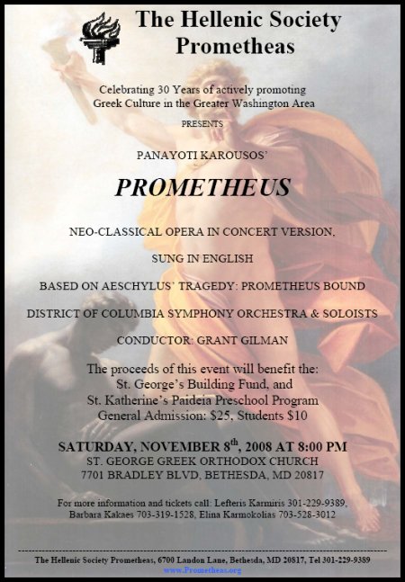 The Hellenic Society Prometheas Celebrating 30 Years of actively promoting Greek Culture in the Greater Washington Area PRESENTS PANAYOTI KAROUSOS’PROMETHEUS NEO-CLASSICAL OPERA IN CONCERT VERSION, SUNG IN ENGLISH BASED ON AESCHYLUS’ TRAGEDY: PROMETHEUS BOUND DISTRICT OF COLUMBIA SYMPHONY ORCHESTRA & SOLOISTS CONDUCTOR: GRANT GILMAN The proceeds of this event will benefit the: St. George’s Building Fund, and St. Katherine’s Paideia Preschool Program General Admission: $25, Students FREE SATURDAY, NOVEMBER 8, 2008 AT 8:00 PM ST. GEORGE GREEK ORTHODOX CHURCH 7701 BRADLEY BLVD, BETHESDA, MD 20817 PURCHASE TICKETS ONLINE THROUGH DCGreeks.com For more information call: Lefteris Karmiris 301-229-9389, Barbara Kakaes 703-319-1528, Elina Karmokolias 703-528-3012 The Hellenic Society Prometheas, 6700 Landon Lane, Bethesda, MD 20817, Tel 301-229-9389