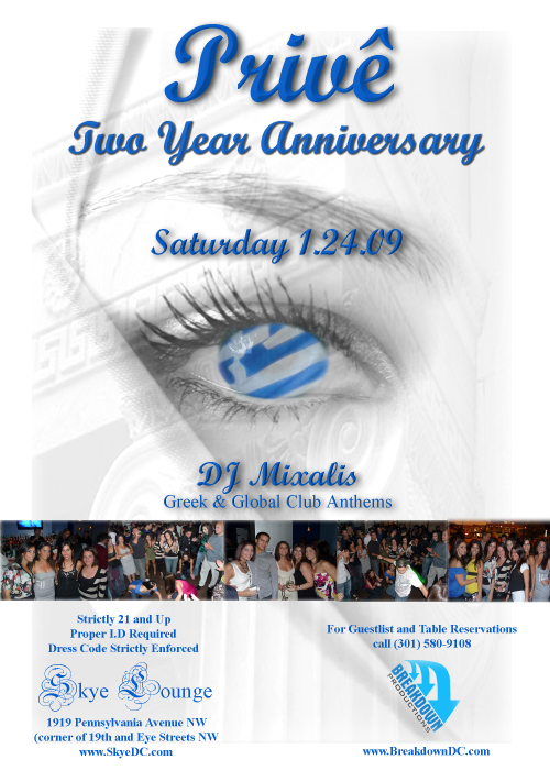 “Privé” Two-Year Anniversary D.C’s Hottest Greek Party Sounds By: DJ Mixalis Greek and Global Club Anthems Strictly 21 and Up Table Reservations Highly Recommended For Table Reservations call (301) 580-9108 For Guestlist email [email protected] www.BreakdownDC.com