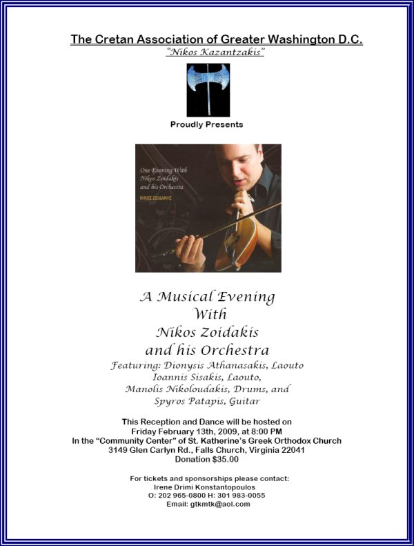 THIS EVENT IS SOLD OUT! The Cretan Association of Greater Washington D.C. "Nikos Kazantzakis"Proudly Presents A Musical Evening With Nikos Zoidakis and his Orchestra Featuring: Dionysis Athanasakis, Laouto Ioannis Sisakis, Laouto, Manolis Nikoloudakis, Drums, and Spyros Patapis, Guitar This Reception and Dance will be hosted on Friday February 13th, 2009, at 8:00 PM In the Meletis-Charuhas Center of St. Katherine’s Greek Orthodox Church 3149 Glen Carlyn Rd., Falls Church, Virginia 22041