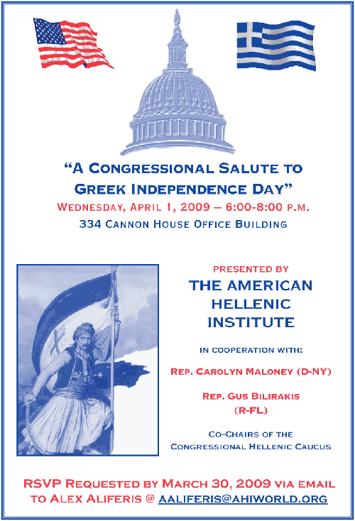 A Congressional Salute to Greek Independence Day Reception: Wednesday, April 1, 2009 -- 6:00 PM - 8:00 PM 334 Cannon House Office Building Special Guest Speakers: Members of Congress Presented by The American Hellenic Institute In Cooperation with: Hon. Carolyn Maloney (D-NY) & Hon. Gus Bilirakis (R-FL) RSVP Requested by March 30, 2009 via email to Alex Aliferis at [email protected].
