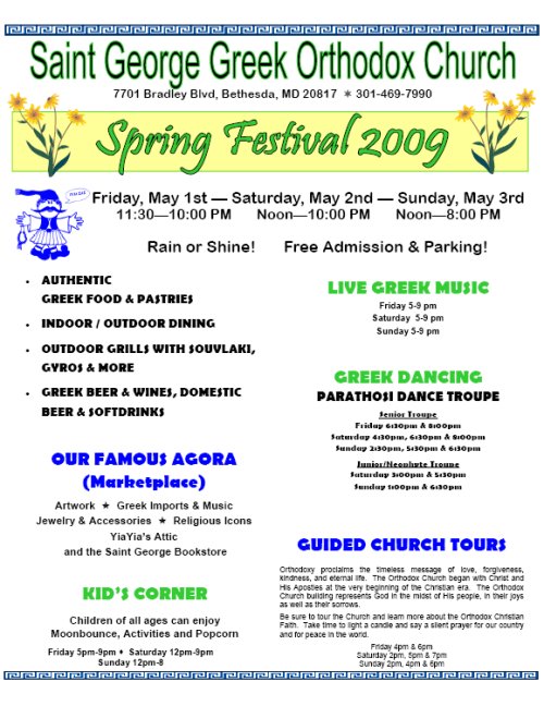 Rain or Shine! Free Admission & Parking! • AUTHENTIC GREEK FOOD & PASTRIES • INDOOR / OUTDOOR DINING •OUTDOOR GRILLS WITH SOUVLAKI, GYROS & MORE • GREEK BEER & WINES, DOMESTIC BEER & SOFT DRINKS OUR FAMOUS AGORA (Marketplace) Artwork ● Greek Imports & Music Jewelry & Accessories ● Religious Icons YiaYia’s Attic and the Saint George Bookstore KID’S CORNER Children of all ages can enjoy Moonbounce, Activities and Popcorn Friday 5pm-9pm ● Saturday 12pm-9pm ● Sunday 12pm-8 LIVE GREEK MUSIC Friday 5-9 pm Saturday 5-9 pm Sunday 5-9 pm GREEK DANCING PARATHOSI DANCE TROUPE Senior Troupe Friday 6:30pm & 8:00pm Saturday 4:30pm, 6:30pm & 8:00pm Sunday 2:30pm, 5:30pm & 6:30pm Junior/Neophyte Troupe Saturday 3:00pm & 5:30pm Sunday 1:00pm & 6:30pm GUIDED CHURCH Orthodoxy proclaims the timeless message of love, forgiveness, kindness, and eternal life. The Orthodox Church began with Christ and His Apostles at the very beginning of the Christian era. The Orthodox Church building represents God in the midst of His people, in their joys as well as their sorrows. Be sure to tour the Church and learn more about the Orthodox Christian Faith. Take time to light a candle and say a silent prayer for our country and for peace in the world. Friday 4pm & 6pm Saturday 2pm, 5pm & 7pm Sunday 2pm, 4pm & 6pm