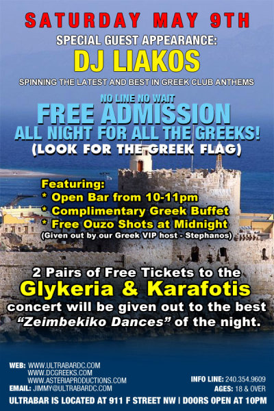 Featuring Open Bar from 10-11 PM Complimentary Greek Buffet Free Ouzo Shots at Midnight (Given out by our Greek VIP Host - Stephanos)