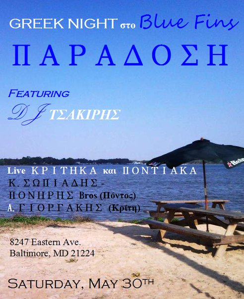 ΠΑΡΑΔΟΣΗ Saturday May 30th, 2009 Featuring D.J. ΤΣΑΚΙΡΗΣ LIVE ΚΡΙΤΗΚΑ και ΠΟΝΤΙΑΚΑ Κ. ΣΩΠΙΑΔΗΣ ΠΟΝΗΡΗΣ Bros (Πόντος) Α. ΓΙΟΡΓΑΚΗΣ (Κρήτη) Blue Fins Bar & Grill is hosting this event. Finally a Greek night done right. Mezedakia available all night at no charge; and entertainment from an up and coming DJ George Tsakiris as well as live Kritika and Pontiaka. The location is right against the water between the Northeast Creek and Back River. The event will be held outdoors where there is a dance floor and bar. Dress Code: It may get cold at night so bring a light jacket; if it rains we will just go indoors and continue the party. Ladies: heals are probably not your best choice of footwear, you might get sand in them. Entertainment for the evening: D.J. Tsakiris For event info contact: Blue Fin Restaurant: (410) 282-5050