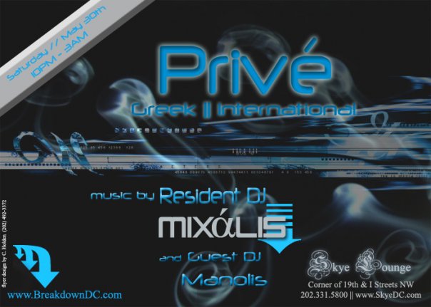 Breakdown Productions Presents DC's Official Greek Night : "Privé" @ Skye Lounge :: Featuring Sounds By DC's Hottest Greek DJ : MiXalis Along w/ Special Guest DJ : Manolis !! Free Before Midnight For Ladies w/ Guestlist or Printout Of Flyer