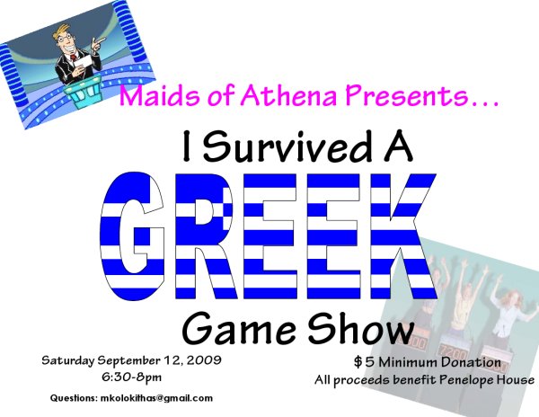 Do your friends and family refer to you as the game show wiz? Ever thought to yourself, I could have won that game show, I knew the answer to that, I could be the last survivor standing…well we have an event for you! Join the Maids of Athena Saturday September 12, 2009 Tickets are $5, doors open at 6:15pm and the show lasts until 8pm. All proceeds raised help benefit Domestic Violence Awareness! Please contact Maids of Athena Grand Treasurer Marianthe Kolokithas to purchase presale tickets at [email protected] or 864-884-4544.