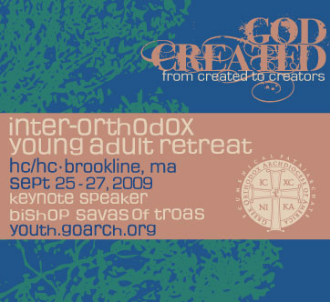 Inter-Orthodox Young Adult RetreatCome explore Orthodoxy and the Arts! The weekend includes workshops on music, movies, pop culture and more, with outdoor activities, a Saturday evening barbeque and music festival. Registration is now open for the Inter-Orthodox Young Adult Retreat, which will take place September 25-27, 2009. This nationwide retreat will take place in Brookline, MA at Hellenic College/Holy Cross Greek Orthodox School of Theology, and will welcome young adults from all jurisdictions. This year’s theme, God Created: From Created to Creators, will focus on Orthodoxy and the arts. His Grace Bishop Savas of Troas, the newly appointed Director of the Office of Church and Society, will be the keynote speaker for the retreat, now in it’s seventh year of existence. For retreat details, hotel information, and online registration, please visit http://www.youth.goarch.org. Full Registration Packages: