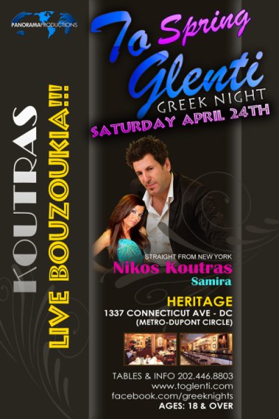 PANORAMA PRODUCTIONS IS PROUD TO PRESENT To Spring Glenti 2010 Greek Night at Heritage April 24th, 2010 Featuring Straight from New York Live Bouzoukia by NIKOS KOUTRAS With Special Guest Samira DOORS OPEN AT 10:30 PM Tables and Info: (202) 446-8803