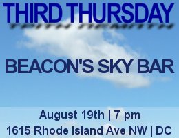 August, 2010's Third Thursday will be held on August 19, 2010 at Beacon's Sky Bar in the roof-top of the Beacon Hotel, two blocks south of Dupont Circle, starting at 7:00 PM.  One of the summer’s seasonal attractions, this popular alfresco cocktail lounge features spectacular views of the Dupont Circle neighborhood, Embassy Row and expanses of the city skyline in the heart of Washington, DC. The lounge features creative and unique martinis and cocktails with innovative light fare.