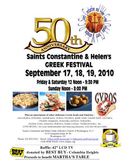 Sts. Constantine and Helen Greek Orthodox Church offers the largest & oldest Greek festival in the Washington, D.C. area. We bring a "Taste of Greece" to the areas neighborhoods and suburbs. The festival is open to the public with FREE admission, FREE parking and covered eating areas. Credit cards are accepted. In addition to Greek food, the festival features authentic Greek coffees, beers, wines, and live Greek music. Our Greek Marketplace offers books, jewelry, trinkets and religious items.