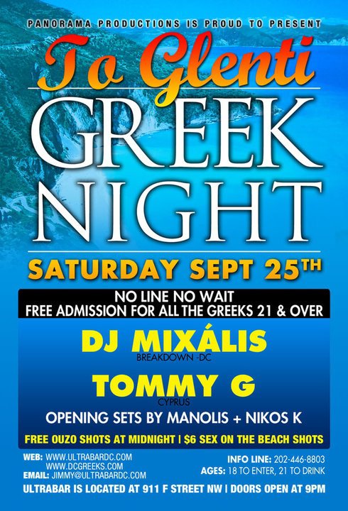 PANORAMA PRODUCTIONS IS PROUD TO PRESENT To Glenti Greek Night at ultrabar Saturday September 25th, 2010 Featuring DJ MIXÁLIS BREAKDOWN-DC TOMMY G CYPRUS Opening Sets by Manolis + Nikos K FREE OUZO SHOTS AT MIDNIGHT NO LINE NO WAIT! FREE ADMISSION ALL NIGHT LONG FOR ALL THE GREEKS 21 & OVER!