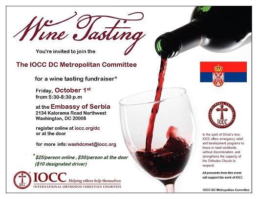 You're invited to join the IOCC Metropolitan Committee of Washington, DC for a wine tasting fundraiser on Friday, October 1, from 5:30-8:30pm at the Embassy of Serbia, which is conveniently located near both the Dupont Circle metro and the Woodley Park-Zoo/Adams Morgan metro. Public transportation is highly encouraged as there is limited parking. Be one of the first 30 guests to arrive and receive a complimentary LiveGreen membership (a $13 value) to save on purchases at eco-friendly business in the DC metropolitan area! $25 registration online at www.iocc.org/dc or $30 at the door All proceeds will benefit the work of International Orthodox Christian Charities, the official humanitarian aid organization of Orthodox Christians. More info at www.iocc.org.