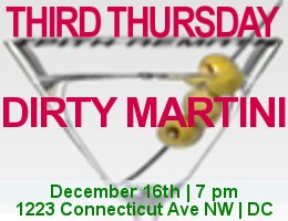 Recently opened in the space formerly occupied by 1223, Dirty Martini in Dupont Circle is the site for December, 2010's Third Thursday on December 16, 2010 starting at 7:00 PM.