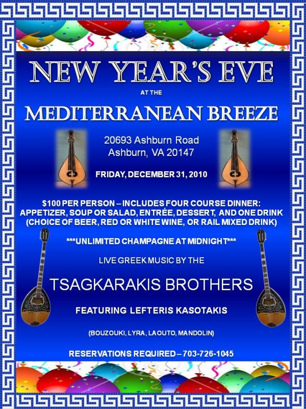 NEW YEAR'S EVE AT THE MEDITERRANEAN BREEZE FRIDAY DECEMBER 31, 2010 $100 PER PERSON INCLUDES FOUR COURSE DINNER (APPETIZER, SOUP OR SALAD, ENTREE, DESSERT) *** UNLIMITED CHAMPAGNE AT MIDNIGHT *** LIVE GREEK MUSIC BY THE TSAGKARAKIS BROTHERS FEATURING LEFTERIS KASOTAKIS RESERVATIONS REQUIRED — (703) 726-1045