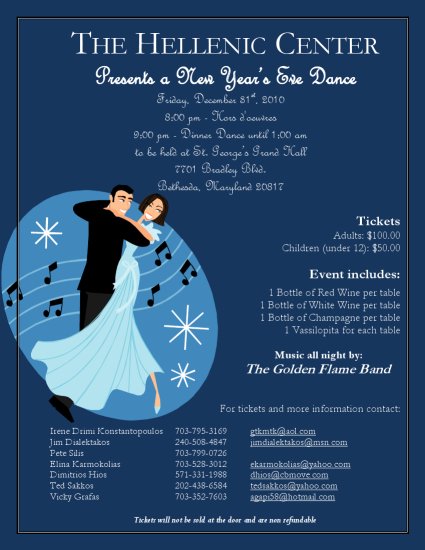 THE HELLENIC CENTER Presents a New Year's Eve Dance Friday, December 31 st, 20108:00 pm - Hors d'oeuvres St. George's Grand Hall Tickets