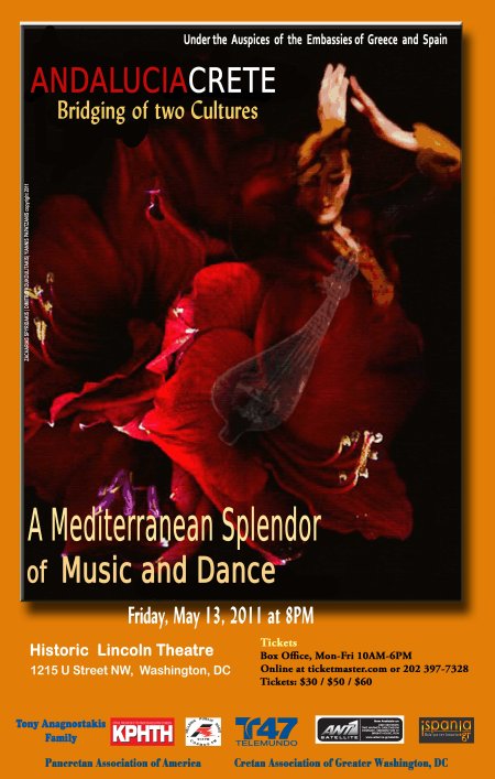 ANDALUCIA-CRETE Bridging of Two Cultures Friday May 13, 2011 at 8 PM Historic Lincoln Theatre Tickets: $30 / $50 / $60 Lincoln Theatre Box Office, Monday-Friday 10AM-6PM The Pancretan Association of America through the efforts of its Culture & Education Committee and the support of the Embassies of Greece and Spain, proudly presents the "Bridging of Two Cultures: Andalucía – Crete", a concert event of music and dance. This is a unique and exceptional intercultural cooperation of musicians and dancers from Andalucía (Spain) and Crete (Greece). These two musical traditions inextricably linked through dance, as well as the improvisational mood of each individual musician, yield an exciting and refreshing insight to the two regional cultures. The common and strongly felt passion in music and dance of these cultures will be show-cased, for the first time, on the stage of the Historic Lincoln Theatre, by a group of renowned musicians and dancers from both the Greek island of Crete and the Andalucía region of Spain. It will be a unique opportunity not to be missed! Preview: