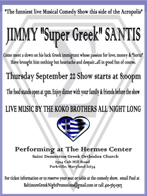 "The funniest live Musical Comedy Show this side of The Acropolis" JIMMY "Super Greek" SANTIS Performing at The Hermes Center Come meet a down on his luck Greek immigrant whose passion for love, money, & "horta" Thursday September 22, 2011 | Show starts at 8:00 PM The food stands open at 5 PM. Enjoy dinner with your family & friends before the show! LIVE MUSIC BY THE KOKO BROTHERS ALL NIGHT LONG For ticket information or to reserve your seat or table at the comedy show, email Paul at [email protected] or call (410) 365-1703!