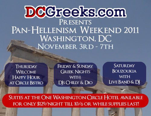 For full details including a schedule of events, registration packages, hotel information, list of cosponsoring organizations (and how to become one), and the latest up-to-date info, visit the DCGreeks.com Pan-Hellenism Weekend 2011 Page at: http://www.DCGreeks.com/PanHellenismWeekend
