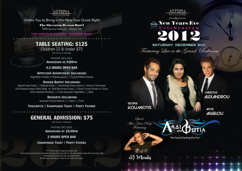 Asteria Productions presents the 8th Annual New Years Eve Hotel Party at the Sheraton Reston Hotel featuring live Greek music Bouzoukia style w/ Ladi Sti Fotia & Special After-Hours Party w/ DC's own DJ Mixalis