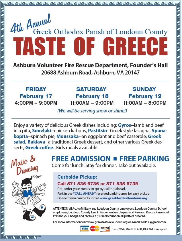 Ashburn Volunteer Fire Rescue Department l Inside Founder�s Hall FRIDAY FEBRUARY 17TH 4PM - 9PM SATURDAY FEBRUARY 18TH NOON - 9PM SUNDAY FEBRUARY 19TH NOON - 8PM Free Admission Dine-in (or) Take-out Featuring! Authentic Greek Food l GYROS l SOUVLAKI l MOUSSAKA l PASTITSIO Spanakopita l Greek Salad l Greek Fries l GREEK DESSERT Soft Drinks l Coffee l Continuous Greek Music Scheduled Greek Dance Performances Gather your family and friends and enjoy a wonderful meal. Kids meals are available too! No tickets are required. Just come and enjoy! Attention Loudoun County Government Employees, Loudoun County Public School employees, Loudoun County and municipal Firefighters, Law Enforcement and Military personnel. Present your badge when ordering and receive $1.00 off a platter. Discount applies to employee only.