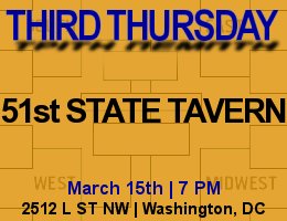 Third Thursday | The 51st State Tavern | March 15, 2012Join us on Thursday, March 15, 2012 at 7 PM at The 51st State Tavern near Foggy Bottom in Washington, DC for this month's Third Thursday. With March's Third Thursday coinciding with the 1st round of the NCAA Men's Basketball Tournament, we've picked a place that's perfect for those of you who wish to follow the action, with a venue featuring 9 TV screens, including a 60" plasma and 2 40" LCDs. Opened during Labor Day Weekend 2004, The 51st State Tavern has quickly become the favorite hangout/neighborhood bar of local residents, office workers and students in the West End. The 51st State Tavern Specials $3.50 Yuenglings, 8 PM to Close Getting There Driving Directions See you there, Aristotelis Chronis | Themistocles Chronis | Sofia Plagakis | Christiana Shoushtari | Michael Veronis If you have a suggestion on where the next Third Thursday should be, email us at [email protected], join our Facebook group. We would love to hear from you! Since 2001, Third Thursday has provided Greek-Americans, Greeks, Cypriots, and Philhellenes from the Washington, DC area and beyond the chance to meet every month in a relaxed atmosphere, particularly welcoming those who have moved from different parts of the country for work or school into the greater DC area Greek community. With visits to a variety of bars, restaurants, and lounges in the most vibrant neighborhoods of DC, Maryland, and Virginia, Third Thursday is a great way to catch up with old friends and make new ones in the Greek community. As it now embarks on its third iteration since its founding, we promise to maintain the simple principles of its founders, while expanding the event to an ever-changing audience of Greeks in the area. We look forward to seeing you -- or meeting you for the first time -- at the next Third Thursday.