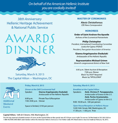 | Event's Web Site: | http://www.ahiworld.com/media-center/announcements/2013/1707-38th-anniversary-hellenic-heritage-achievement-and-national-public-service-awards-dinner.html |