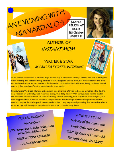 Some families are created in different ways but are still, in every way, a family. Writer and star of My Big Fat Greek Wedding, Nia Vardalos firmly believed she was supposed to be a mom, but Mother Nature and modern medicine had put her in a headlock. So she made a choice that shocked friends, family, and even herself: with only fourteen hours' notice, she adopted a preschooler.