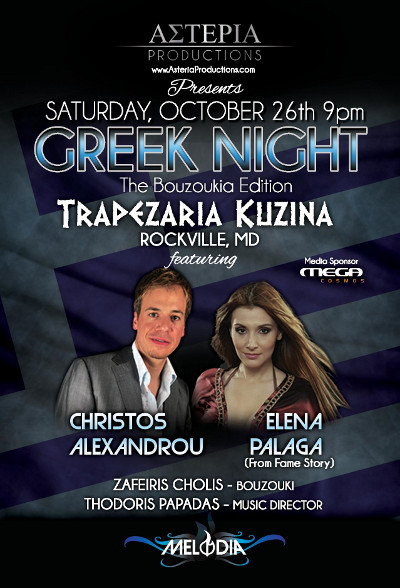 Featuring CHRISTOS ALEXANDROU and From Fame Story ELENA PALAGA Together w/ Melodia's Maestro Thodoris Papadas & Zafeiris Holis on Bouzouki Dinner Reservations 9pm