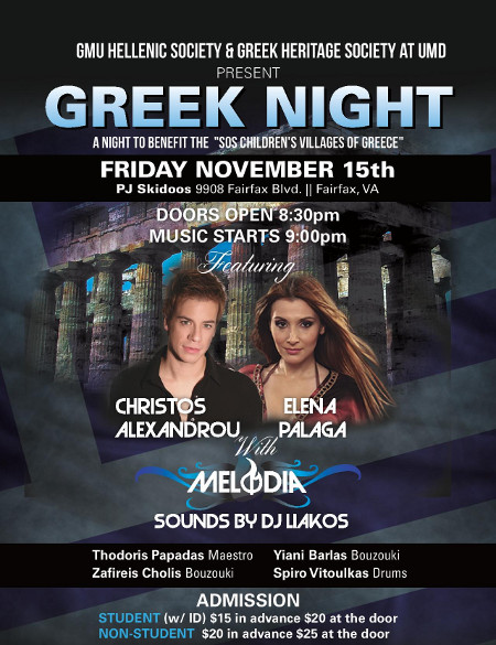 Join us for a night of food, music, and dancing. The GMU Hellenic Society and UMD Greek Heritage Society are hosting this bouzoukia night to raise money for the charity SOS Children's Villages in Greece, an organization which gives aid to orphans in Greece. Melodia and DJ Liakos from Asteria Productions will be the entertainment for the evening.