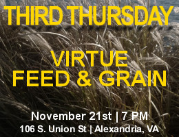 Join us on Thursday, November 21, 2013 at 7 PM at Virtue Feed & Grain as Third Thursday returns to Old Town Alexandria for the first time in over two years!  Now a modern American tavern, Virtue Feed & Grain takes its name from the building’s long-ago function as a feed house. Soaring open windows, exposed brick and giant iron girders frame the urban scene. This bi-level, airy warehouse also includes an outdoor lounge, TVs at each of the bars, and a private Porch lined with leather couches.