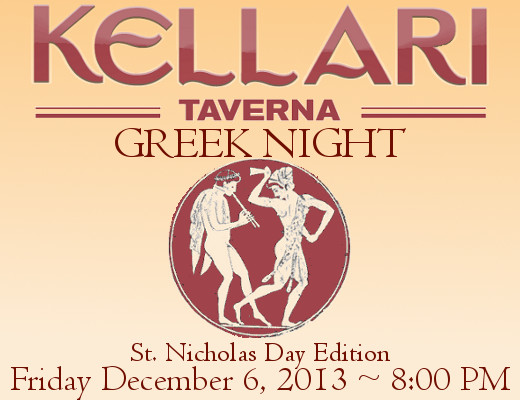 Friday, December 6th, 2013 Please join us on Friday December 6th, 2013 for a fun evening of authentic Greek music, food and dancing as we celebrate St. Nicholas Day with all the Nicks, the Nikis and the like! Choose from our full menu of authentic Greek dishes and our Wine Spectator award-winning Greek and imported wine list while you enjoy traditional Greek music by The Golden Flames starting at 8:00 PM. Dinner reservations are encouraged or come for drinks at the bar with scores of Greek young professionals.