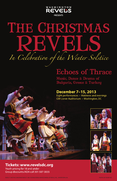 Washington Presents The Christmas Revels Echoes of Thrace December 7–15, 2013 Eight Performances • Matinees and Evenings Our 31st annual celebration of the Winter Solstice harkens back to ancient Thrace – legendary home of Orpheus, Bringer of Music, whose evocative notes open our story. His melodies scatter to the regions of Bulgaria, Greece, Thracian Turkey, and beyond, where each culture shapes them into traditions of its own. Revel with families of an imagined village where these colorful folk traditions weave together. Gather in the village square to celebrate the turning of the year! Amid a swirl of beautiful costumes, meet iconic folk characters including giant Bulgarian masked kukeri, the Thracian "Christmas camel", and the kallikantzaroi – goblins who make trouble during the 12 days of Christmas and are vanquished on Epiphany. Delight in children caroling door-to-door playing on silvery triangles and offering blessings with survachka sticks. Celebrate with familiar Revels songs and sing-alongs, seasonal carols from Thrace and beyond, thrilling choral arrangements of ancient folk melodies, haunting Slavonic harmonies, fiery instrumentals and folk dances, and a rollicking mummers’ play featuring folk characters from the region. Our cast of over 100 singers, dancers, actors and instrumentalists, ages 8–85, includes our Revels choruses and Washington Revels Brass plus an extraordinary array of folk artists from our featured cultures.