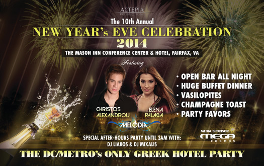 The Hellenic Society Paideia Invites you to come celebrate New Years Eve 2014 Join us December 31st, 2013 at 9 PM at the Bull & Bear Club in downtown Richmond as we celebrate New Year's Eve 2014! Joining us this year is Greek Singer Katerina Topazi! Enjoy beautiful views of the city from the 21st floor of the James Center, delicious appetizers & desserts, Vasilopita, a balloon drop, and of course Greek Dancing! All proceeds will go towards Virginia Tech's Modern Greek Language Program. Tickets: Purchase tickets online or call (860) 906-4264! Complimentary Parking is available underneath the building. For more information please visit www.paideiausa.org or call (860) 906-4264.