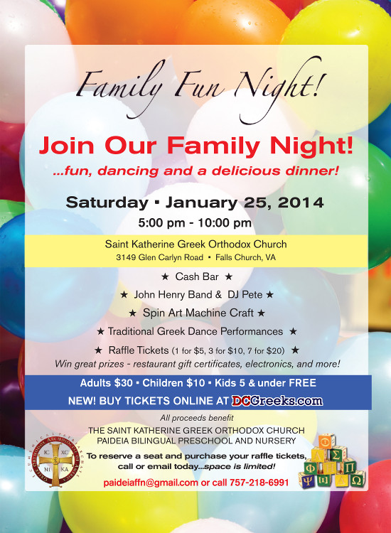 Join Our Family Night! * Cash Bar * Saint Katherine Greek Orthodox Church Adults $30 • Children $10 • Kids 5 & under FREE Purchase Tickets online through Tickets@DCGreeks.com with No Service Charge! Space is limited! Purchase your tickets today! All proceeds benefit