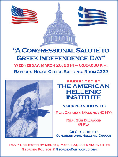 A Congressional Salute to Wednesday, March 26, 2014 6:00 PM - 8:00 PM Rayburn House Office Building, Room 2322 Presented by The American Hellenic Institute In Cooperation with: Rep. Carolyn Maloney (D-NY) & Rep. Gus Bilirakis (R-FL) RSVP Requested by Monday March 24, 2014