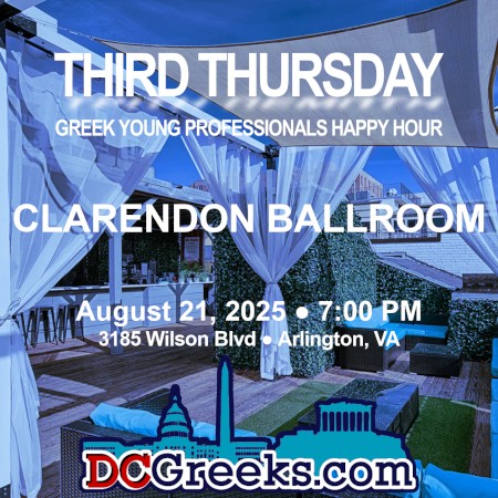 Join us on Thursday, August 21, 2025 at 7:00 PM as the Third Thursday Greek Young Professionals Happy Hour series visits the rooftop of Clarendon Ballroom in Arlington, VA. Located just steps from the Clarendon Metro, this multi-level venue features a lush rooftop escape with cabanas, open-air seating, and panoramic views. Enjoy rooftop hour specials until 9:00 PM, including $5 Domestic Cans, Margaritas, and Shooters, $6 Seltzers, Draft Beers, and Well Drinks along with a selection of $5 small bites.