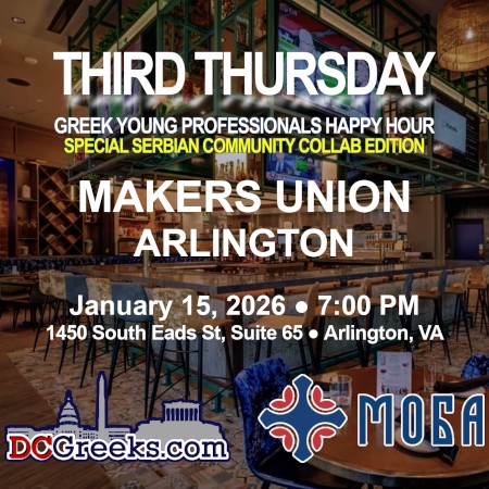 Third Thursday Greek Young Professionals Happy Hour Join us on Thursday, January 15, 2026 at 7:00 PM as the Third Thursday Greek Young Professionals Happy Hour series visits Makers Union Arlington at National Landing in Arlington, VA for a special collaboration with our friends at MOBA, the Serbian Community Platform in DC. MOBA connects and empowers Serbs in the Washington DC Metropolitan area through community, culture, and collaboration. Located in Metropolitan Park at Amazon HQ2, Makers Union offers a lively neighborhood pub atmosphere with creative American comfort food. On Thursdays, their popular ‘Tini Takeover features $7 martinis from 4:00 PM to close, along with shareable apps served in oversized martini glasses.