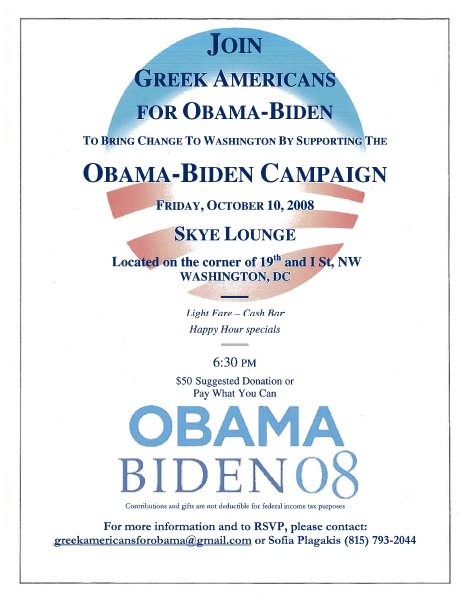 Join Greek Americans for Obama-Biden To Bring Change To Washington by Supporting the Obama-Biden Campaign Friday, October 10, 2008 Skye Lounge Located on the corner of 19th & I Sts NW Washington, DC Light Fare -- Cash Bar Happy Hour Specials 6:30 PM $50 Suggested Donation or Pay What You Can Contributions and gifts are not deductible for federal income tax purposes For more information and to RSVP, please contact