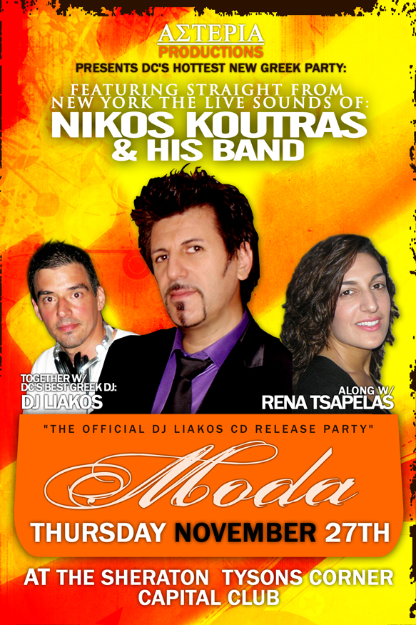 ASTERIA PRODUCTIONS PRESENTS MODA A NEW GREEK CONCEPT FEATURING STRAIGHT FROM NEW YORK CITY THE LIVE SOUNDS OF NIKOS KOUTRAS AND HIS BAND ALONG WITH RENA TSAPELAS AND DC's OWN DJ LIAKOS---MODA THE THANKSGIVING EDITION & DJ LIAKOS CD RELEASE PARTY