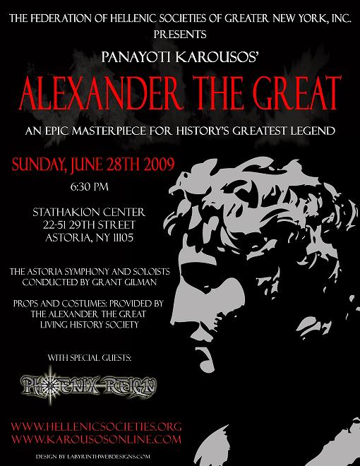 THE EPIC OPERA “ALEXANDER THE GREAT” OF PANAYOTI KAROUSOS The long anticipated epic of Greek-Canadian neo-classical composer Panayoti Karousos opens with the famous enthronement scene of Alexander the Great and introduces his famous parents, King Phillip II of Macedonia and Queen Olympias of Epirus. Under the baton of conductor Grant Gilman, all the famous events of this Greek era will come alive with the larger than life personalities of Aristotle, Isokrates and Demosthenes. During the production, events and battles of Alexander’s extraordinary battle against the Persians will unfold. There are the grand scenes of the crowning of Alexander as Pharaoh in Egypt, the battles of Gaugamela, the Indian campaigns, the royal weddings at Susa and finally the death of the Great Macedonian general. This presentation of visionary composer Panayoti Karousos is destined to be a new opera classic. Parts and highlights of the opera will be presented at the Stathakion Center in Astoria, Queens as a preview, for the full opera is anticipated to debut next year in Carnegie Hall. (www.karousosonline.com ) The opera will be performed by the Astoria Symphony Orchestra and soloists conducted by Grant Gilman: It will also feature special guests, Phoenix Reign, who will perform their two epics, The Odyssey and The Legend of Alexander with the symphony. Stage costumes and re-enactors will be provided courtesy of Peter Giakoumis and The Alexander The Great Living History Society. Event will be co-hosted by Byzantine Crown Productions with a special multimedia presentation featuring Greek artist, Iannis Nikou. Mr. Nikou’s Alexander the Great paintings will be gracing the concert program. (www.iannisnikou.gr ) Music Festival 2009 live at the Stathakion Center is brought to you by The Federation of Hellenic Societies of Greater New York Inc 22-51 29th St Astoria, NY 11105