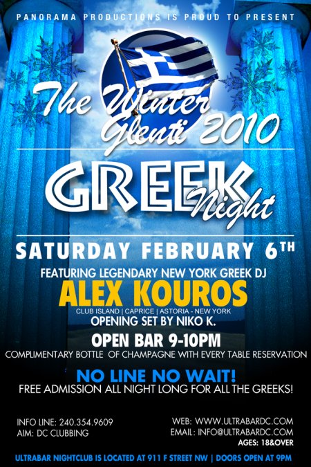 | 2/4/10: Due to the impending snow storm, and the severe and dangerous driving conditions that will occur, we have decided to cancel the winter Glenti Greek night that was scheduled for this Saturday, February 6 at Ultrabar. A new date will be announced very soon. We apologize for the inconvenience. Have a safe and happy weekend! -- PANORAMA PRODUCTIONS |
