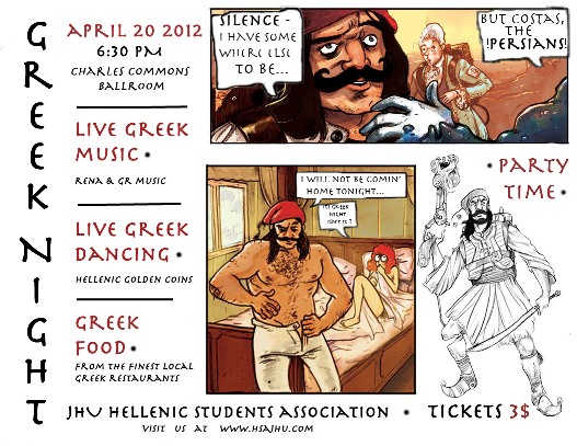 The Johns Hopkins Greek Night 2012 will be taking place on Friday, April 20, 2012, at 6:30 pm, at the Charles Commons Ballroom This year we will be having live Greek music by a New York band, called GR Music. (Synthesis: Rena - singer, Giannis - bouzouki, Kalivas - harmonium, Vassilis - violin, Giorgos - guitar) For once again, the St. Nicholas Hellenic Golden Coins and their director Maria Kaimakis will be performing traditional dances from different regions of Greece. The finest local Greek-owned restaurants will be providing amazing Greek food including: Greek Salad, Spinach Pie, Tzatziki, Pita Bread, Olives, Oven Potatoes, Tomato Mozarella Salad, Pastitsio, Souvlaki on the stick (both pork and chicken), Gyro, Meatballs, Shrimp, Crabcakes as well as Baklava, Galaktoboureko and Rice Pudding. Our Food Sponsors as of now include: Ikaros Restaurant (Greektown), Samos Restaurant(Greektown), Valentino's (Downtown), Della Notte (Little Italy), Double T Diner (Catonsville), Hellas Lounge (Millersville). Buy your ticket as soon as you can! Ticket Prices: JHU Students (beforehand): $2 To purchase your ticket beforehand please contact a member of the Hellenic Students Association. If you cannot find one, please email us at [email protected] We will be also giving out free Greek Night 2012 T-Shirts, like last year, as well as Greek Night 2012 wristbands! Finally, we will also give out Gift Cards to the finest restaurants in downtown Baltimore! This year's Greek Night will be mainly sponsored by Aris Melissaratos (The Aris Institute) and John Korologos (Double T Diner)