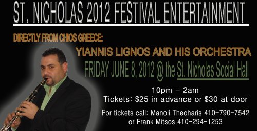 St. Nicholas Greek Folk Festival Friday Night Bouzoukia Afterhours Featuring Direct from Chios, Greece YIANNIS LIGNOS AND HIS ORCHESTRA Peforming Live at the St. Nicholas Social Hall Friday June 8, 2012 Tickets: $25 in advance, $30 at the door 21 to Drink For tickets call:
