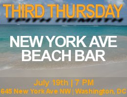 Join us on Thursday, July 19, 2012 at 7 PM at the newly opened New York Avenue Beach Bar in Washington, DC for this month's Third Thursday. Opened on Memorial Day Weekend of 2012, New York Avenue Beach Bar has brought the beach to DC in the form of a 70-ton pit of Ocean City-sourced sand spread across 5,500 square feet on New York Ave. The Beach Bar features a simple selection of beer, rum punch, and daiquiris, and food by a recently debuted Sundevich food truck.