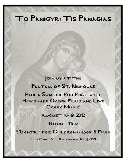 To Panigyri Tis Panagias Join us at the Plateia of St. Nicholas For a Summer Fun Fest with Homemade Greek Food and Live Greek Music! August 18-19, 2012 Noon – 11pm $10 entry fee; Children under 5 Free 701 S. Ponca St. | Baltimore, MD | 21224