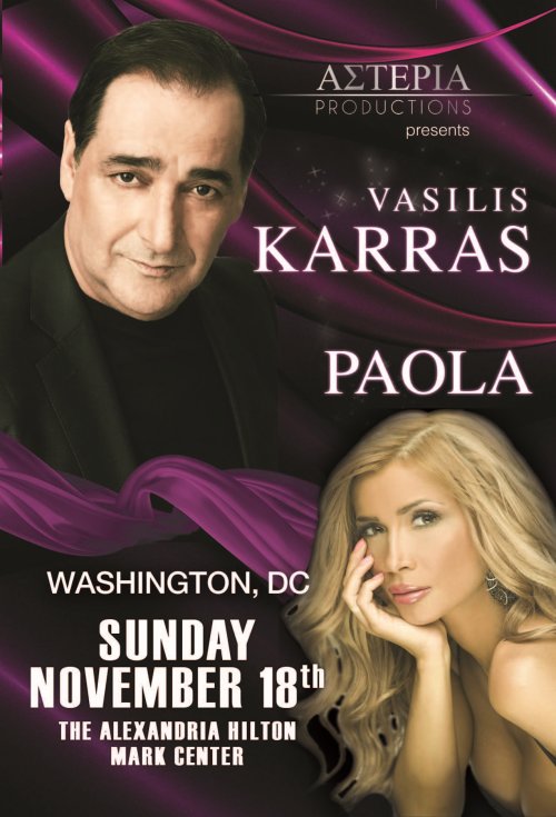 Presents SUNDAY NOVEMBER 18, 2012 VASILIS KARRAS & PAOLA LIVE IN DC Together w/ Pantelis Pantelidis & Orchestra!!! The Alexandria Hilton Mark Center 5000 Seminary Rd. || Alexandria, VA DOORS OPEN 8:00PM || SHOW STARTS 9:00PM TICKETS NOW ON SALE!!! TABLE RESERVATIONS: $135 - $125 - $115 (14 Per Table) GENERAL ADMISSION: $85 (Drink Included) CLICK HERE TO VIEW THE FLOOR DIAGRAM & TO PURCHASE TICKETS ONLINE TO RESERVE BY PHONE & FOR MORE INFO CALL: ASTERIA PRODUCTIONS 1-877-878-4404 or 703-371-9898 KENTRIKON: 410-675-4100 or visit www.AsteriaProductions.com