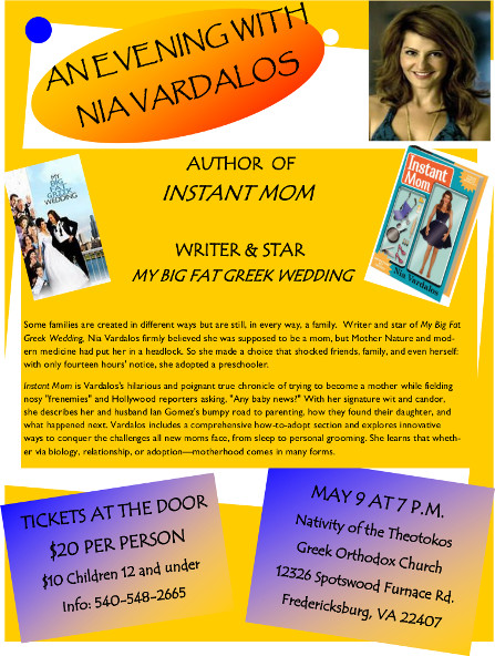 POSTPONED! NEW DATE AND TIME TBA! AN EVENING WITH NIA VARDALOS AUTHOR OF INSTANT MOM WRITER & STAR MY BIG FAT GREEK WEDDING Some families are created in different ways but are still, in every way, a family. Writer and star of My Big Fat Greek Wedding, Nia Vardalos firmly believed she was supposed to be a mom, but Mother Nature and modern medicine had put her in a headlock. So she made a choice that shocked friends, family, and even herself: with only fourteen hours' notice, she adopted a preschooler. Instant Mom is Vardalos's hilarious and poignant true chronicle of trying to become a mother while fielding nosy "frenemies" and Hollywood reporters asking, "Any baby news?" With her signature wit and candor, she describes her and husband Ian Gomez's bumpy road to parenting, how they found their daughter, and what happened next. Vardalos includes a comprehensive how-to-adopt section and explores innovative ways to conquer the challenges all new moms face, from sleep to personal grooming. She learns that whether via biology, relationship, or adoption—motherhood comes in many forms. MAY 9, 2013 AT 7 PM Nativity of the Theotokos TICKETS AT THE DOOR $20 Per Person